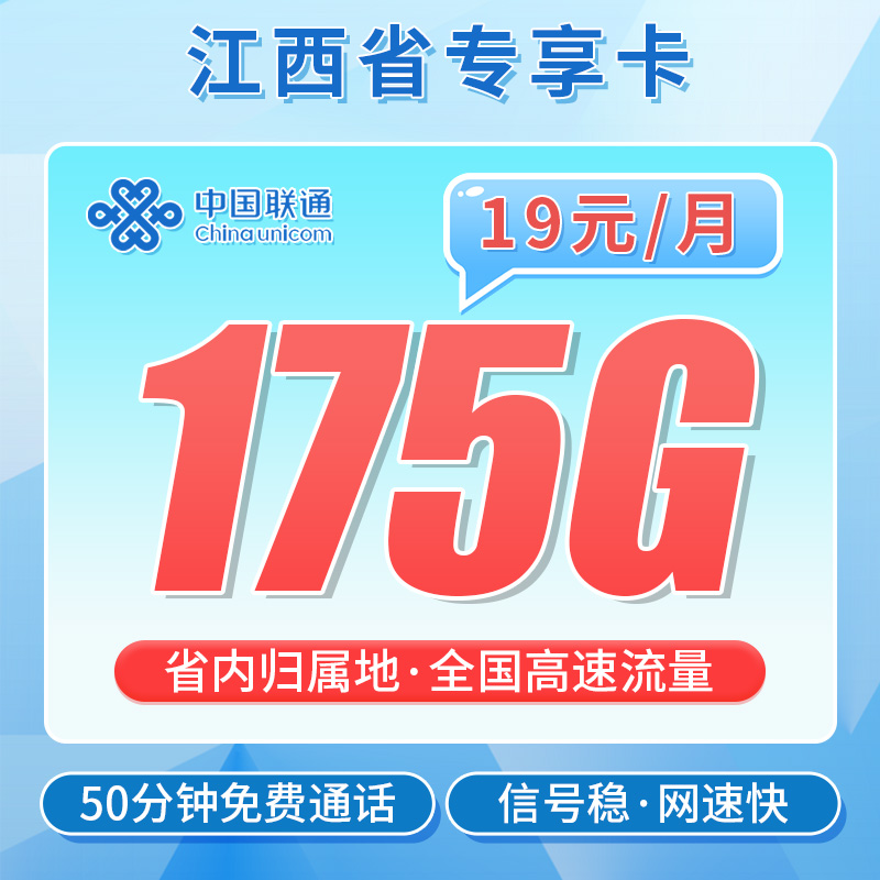 联通亦橙卡19元175G+50分钟归属地:江西不发地区:只发江西备注:-配送方式:京东上门激活方式:上门激活首充渠道:任意渠道办理年龄:18-60岁违停复机:局方停机:可优先在中国联通APP点击基础服务-二次实人认证或到营业厅办理认证复通套餐合约:无合约套餐构成:首月全价全量直接扣除19元(月底到货建议月初激活)第2-24个月19元/月,第 25个月恢复29元/月,145G全国通用+30G省内定向