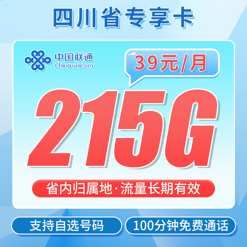 联通天府卡39元215G+100分钟归属地:四川不发地区:只发四川省内备注:-配送方式:人工上门激活方式:上门激活首充渠道:任意渠道办理年龄:18-60岁违停复机:复机方式:联通APP搜索【二次实名】按提示操作或到营业厅办理认证套餐合约:24个月合约套餐构成:首月不免费,全价全量,直接扣费39元(月底到货建议月初激活)第2-12个月39元/月,第13个月开始40元/月,135G全国通用+80G四川