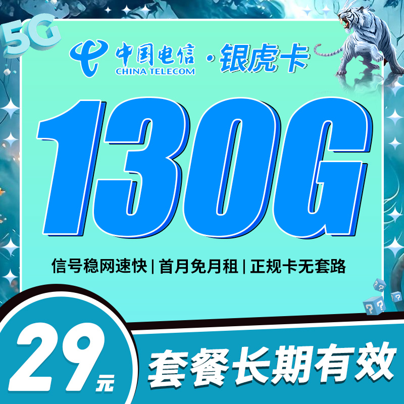电信银虎卡29元130G套餐构成首月免费,之后每月29元/月,赠送的100G通用 (其中50G领取后次月生效)+30G定向流量长期有效,激活首月套餐内流量按天折算到账归属地湖南不发地区西藏、新疆、云南具体以运营商审核为准配送方式邮政/顺丰/京东激活方式自助激活首充渠道激活过程中自动跳转首充办理年龄18-60岁违停复机-套餐合约无合约注销方式支持异地注销、当地营业厅注销、中国电信APP线上注销