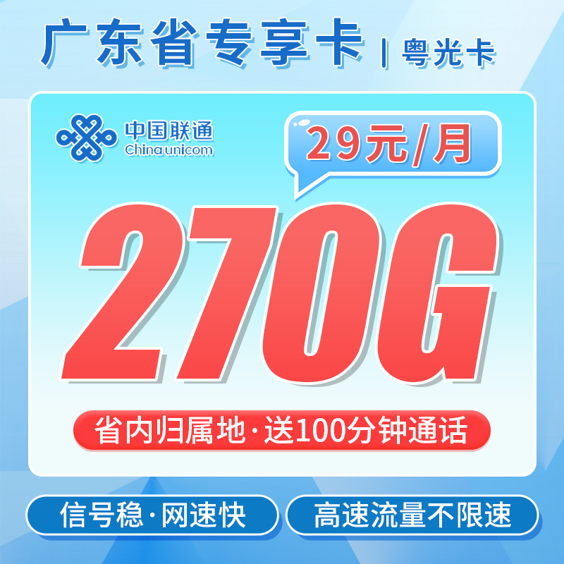 联通粤光卡29元270G+100分钟