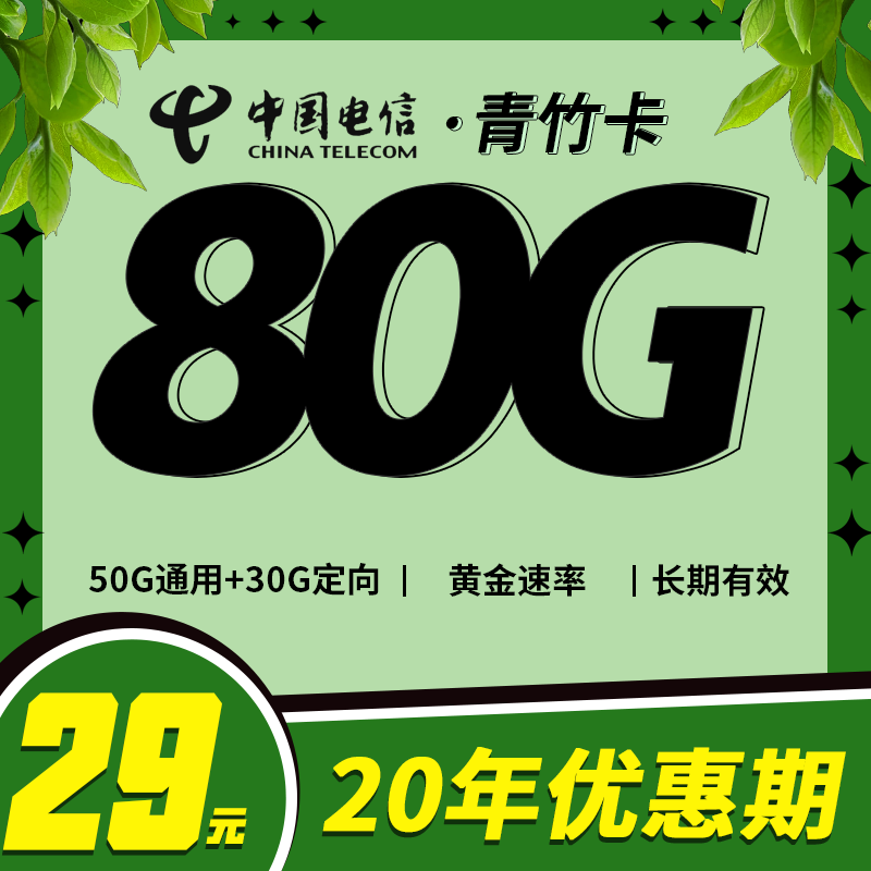 电信青竹卡29元80G+高速流量!