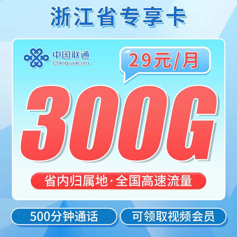 联通浙江卡29元300G+500分钟+视频会员!