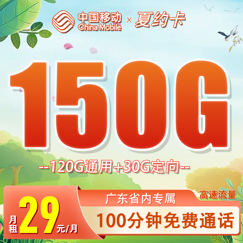 移动夏约卡29元150流量+100分钟通话套餐构成第1-48个月29元包120G全国通用+30G全国定向+100分钟通话到期恢复原套餐归属地广东不发地区仅发广东配送方式京东/顺丰激活方式上门激活首充渠道任意渠道一次性充值100元办理年龄18-30岁违停复机-套餐合约48个月合约注销方式支持异地注销、营业厅注销,合约期内注销有违约金,违约金=(原套餐月租-当前月租)×已履约月份,如有变动以官方为准