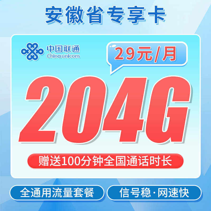 联通安徽卡29元204G+100分钟+安徽专属!