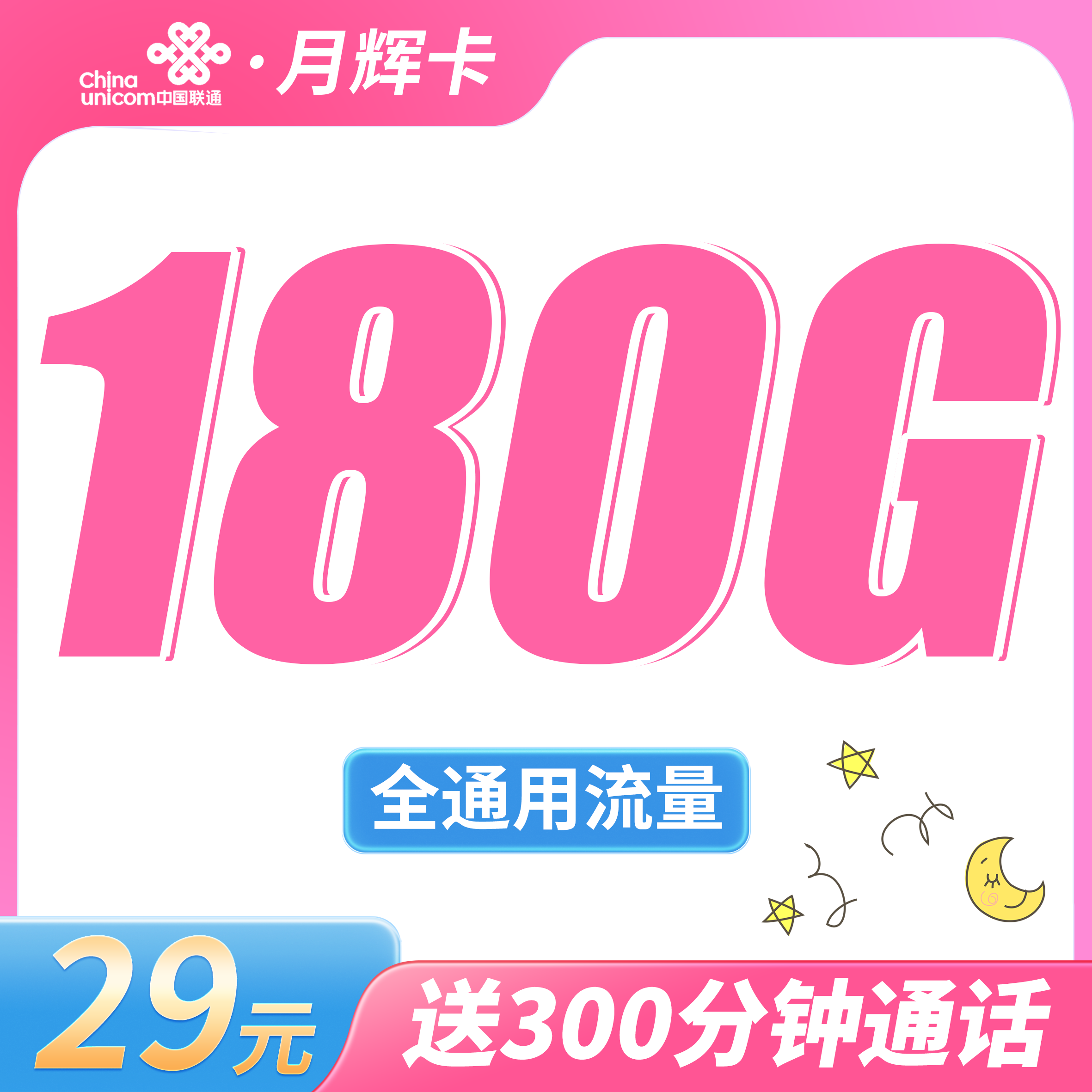 联通月辉卡29元180G+300分钟+超大通话!