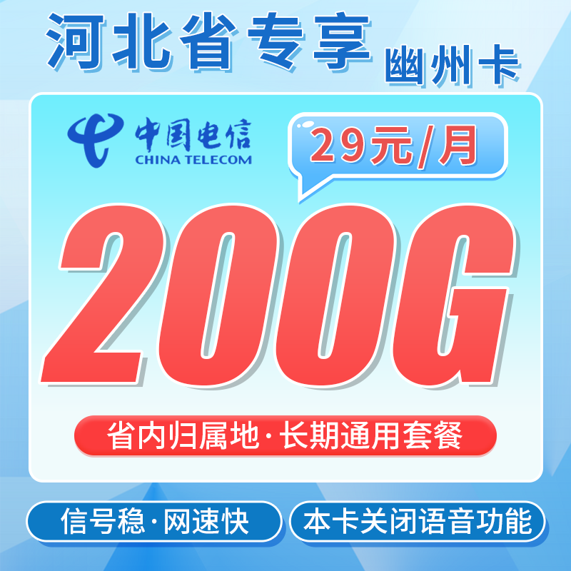 电信幽州卡29元200G通用流量+河北专属!套餐构成首月29元按天扣费;首月200G全国通用流量,次月起每月29元200G全国通用流量,有效期24个月,到期可续归属地河北不发地区该卡仅发河北省配送方式京东/ESM/菜鸟物流激活方式自主激活首充渠道激活时按要求参加首充100元活动办理年龄18-60岁违停复机-套餐合约无合约注销方式支持异地注销、当地营业厅注销、中国电信APP线上注销