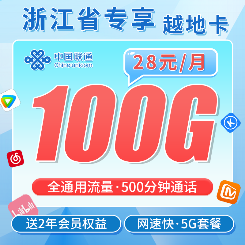 联通越地卡28元100G+500分钟+2年会员+浙江专属!