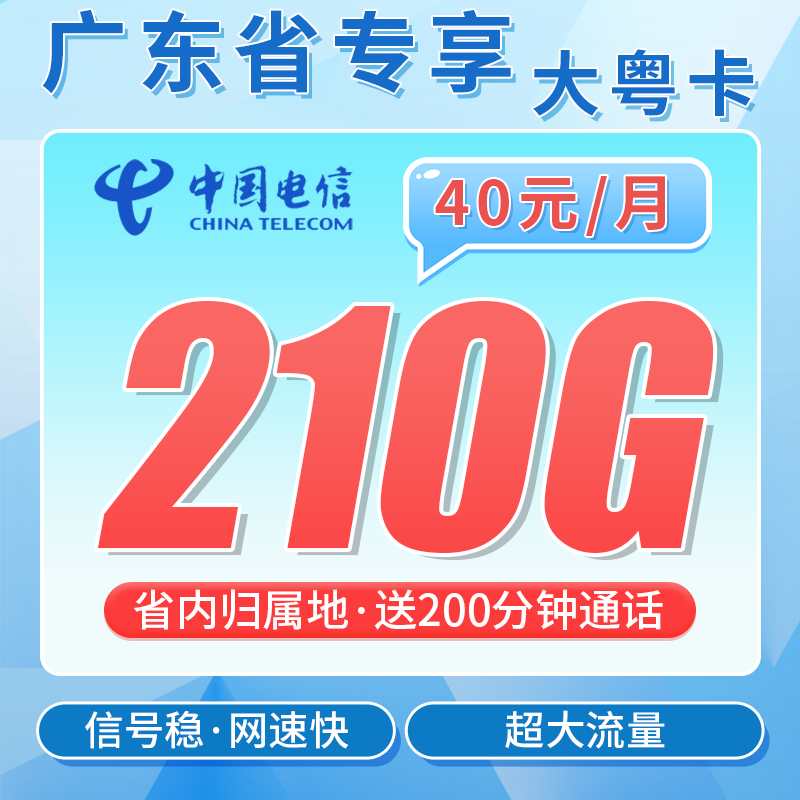 电信大粤卡40元210G全国流量+200分钟+广东专属!